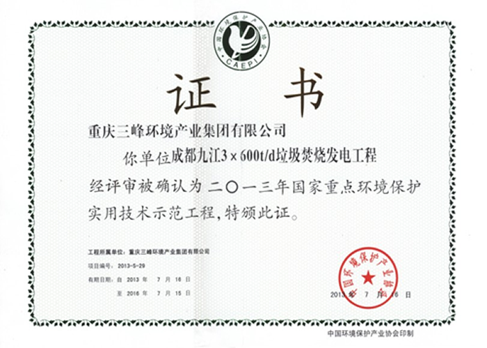 成都九江項目被評為中國環(huán)保產(chǎn)業(yè)協(xié)會環(huán)保示范工程